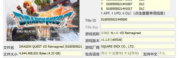 19系统可玩!~ **** 本内容被作者隐藏 **** [NSP] 【港版中文】勇者斗恶龙7重制版: **** 本内容被作者隐藏 **** 需要最低系统版本19.0.1 名称: VII Reimagined [0100505021440000][v0].nsp 大小: 4578953096 字节 : 4366 MiB MD5: 05156e8dc77b0cea873fb ...