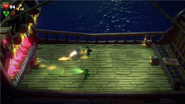 12F 海滩餐厅楼层 回到12F 插上电掣,破坏及吸走巨船 一路进度,响铃后进入BOSS战 打法是吸取木桶炸弹,并在BOSS张开口时射过去 第二阶段时,等待它手刀插进木板才照射攻击 第三阶段时会船身会倾斜,尽快往右射吸盘抓住 之后狂吸木桶炸弹射入BOSS中口便可 重复两次步骤战胜,上二楼用暗光灯救出蘑菇仔 13F 健身房楼层