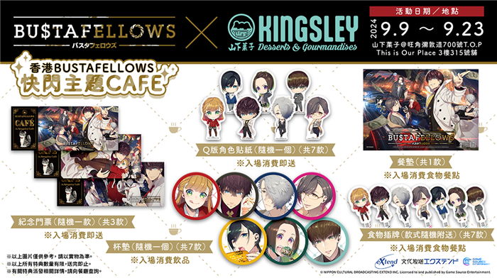 《BUSTAFELLOWS》系列的六位主要角色—— 特乌塔、林波、修、赫尔贝奇卡、莫兹和斯卡克罗的1:1 等身大立牌将在餐厅亮相,他们将会换上特别的装扮在门口恭候各位,欢迎粉丝们前来与他们合影留念!店内还设有多个适合拍照的打卡位,不仅有游戏的主视觉图等装饰,还能看到多款特别的插画喔! 「《BUSTAFELLOWS》香港主题CAFE X 山下果子」限定入场特典 为庆祝《BUSTAFELLOWS》首次在香港举办主题餐厅,我们准备了使用「Yummy!」系列的特别全新绘制插图,以及多款特别设计的入场特典。凡预约或即日walk-in 入场消费用餐,即可获得指定入场特典※! 《BUSTAFELLOWS》香港主题CAFE X 山下果子杯垫(随机一个)(共7 款)※ 入场消费饮品 《BUSTAFELLOWS》香港主题CAFE X 山下果子纪念门票(随机一个)(共3 款)※ 入场消费即送 《BUSTAFELLOWS》香港主题CAFE X 山下果子餐垫(共1 款)※ 入场消费食物餐点 《BUSTAFELLOWS》香港主题CAFE X 山下果子食物插牌(款式随机)(共7 款)※ 入场消费食物餐点 《BUSTAFELLOWS》香港主题CAFE X 山下果子Q 版角色贴纸(随机一个)(共7 款)※ 入场消费即送 ※ 以上图片仅供参考, 请以实物为准。 ※ 以上所有特典数量有限,送完即止。 ※ 有关特典派发相关详情,请向餐厅查询。 给角色及制作团队的话~《BUSTAFELLOWS》信箱及留言板 GSE 乙女部希望透过这次活动将中文玩家的声音与心意传达给新西格的居民们,以及《BUSTAFELLOWS》的制作团队(包括负责原画的すめらぎ琥珀老师等)。现场将设有「BUSTAFELLOWS」信箱和留言板,粉丝们可以把想说的话写成信件投入信箱,或者画成插图张贴在留言板上,我们将代为转交给新西格的居民们,以及《BUSTAFELLOWS》的制作团队(包括负责原画的すめらぎ琥珀老师等)。投稿的信件还有机会在《BUSTAFELLOWS》官方社交媒体专页得到角色们和制作人们的回覆,或许更会在官方广播节目上被读出,敬请期待! 《BUSTAFELLOWS》全新周边商品率先发售 「《BUSTAFELLOWS》香港快闪主题餐厅X 山下果子」活动期间,将同步推出首次发售的《BUSTAFELLOWS》周边商品!新作将推出角色亚加力立牌、角色襟章及角色收藏小卡,参加本次活动的客人可以优先购买现货商品,定必让各位粉丝满载而归! 「BUSTAFELLOWS badge collection vol.1」 角色圆形襟章(全6 款) 港币48 元一个* 随机一款 「BUSTAFELLOWS standee collection vol.1」角色亚克力立牌(全8 款) 港币78 元一个* 随机一款 【香港限定】「BUSTAFELLOWS Yummy! card collection」角色收藏闪卡(全7 款) 港币25 元一张* 随机一款 以上商品将于活动开始同日(9 月9 日)在线上同步开放购买,欲购买的客人可在GSE 周边品牌「Tsubasa~YOLO~」官方商店订购。线上购买之商品将会于活动结束后陆续发货。 ※ 图片仅供参考, 请以实物为准。 ※ 以上商品数量有限,售完即止。 ※ 现场只接受电子支付方式,不设找续,敬请留意。 ※ 本次活动的现货商品只限入场于餐厅消费之客人购买。 ※ 活动现场售卖之商品将视乎情况限制购买数量,敬请留意。 ※ 以上商品开放予香港以外的地区及国家购买,买家需要自行承担邮寄风险及所有产生之费用。如有任何疑问,请电邮至tsubasayolo@hkgse.com 查询。 ※ 以上所有内容,可能会因各种事情及不稳定因素而发生变更,敬请留意。 产品资讯 游戏名称:BUSTAFELLOWS 开发厂商:NIPPON CULTURAL BROADCASTING EXTEND INC. 发行厂商:Game Source Entertainment 游戏类型:女性向恋爱冒险类 对应平台:Nintendo Switch 发售日期:2024 年6 月27 日 建议售价:通常版:港币438 元 限定版:港币718 元 游戏分级:18+ 限制级 游戏字幕:繁体中文 |