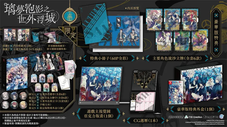 Game Source Entertainment(GSE)今日(10/16)宣布,将首次与日本全新女性向游戏品牌LicoBiTs 合作,于2025 年4 月11 日推出LicoBiTs 旗下首款Nintendo Switch 乙女游戏《璃梦泡影之世外浮城(泡沫のユークロニア)》的亚洲繁体中文版。同时公开豪华版、限定版、预购特典以及通路特典资讯。 《璃梦泡影之世外浮城》是一款在如梦似幻的世界中体会爱情的冒险游戏,由制作人高村旭、角色设计RiRi 、剧本葛林檎等实力派创作者为玩家奉上描绘在梦幻而美丽的世界里萌芽生长的「恋情」的故事。 即日起至12 月13 日,预订《璃梦泡影之世外浮城》亚洲繁体中文版,将可获得精美的预购特典 预购特典 主要人物角色卡(全套6 款) 门票收纳夹(1 个) 限定版特典(包含预购特典) 限定版特典外盒(1 个) 主要角色襟章(全套6 款) Q 版亚克力御守(全套6 款) 主要角色留言卡(全套5 款) 手帐(1 本) 豪华版特典(包含预购及限定版所有特典) 豪华版特典外盒(1 个) 主要角色流沙立牌(全套6 款) 特典小册子(60P 全彩) 游戏主视觉图亚克力版画(1 个) CG 周历(1 本) GSE Otome 联同香港、澳门及台湾部分店家推出通路预购特典,凡于以下指定店家预购Nintendo Switch《璃梦泡影之世外浮城》亚洲繁体中文版,即可额外获赠指定款式的独家特典。 《璃梦泡影之世外浮城》店家特典预订服务销售点名单:https://hkgse.com/UnU 店家特典 透明书签(全套6款) 信纸组(1套,含1款信纸及6款信封) 丝巾(1条) 贴纸(1张) ※ 图片为商品示意图,设计之后有可能变动。 ※ 限定版为受注生产,预购期间至2024 年12 月13 日止,预购截止后不再增加生产。 ※ 数量有限,预购前请先向职员查询。 游戏资讯 游戏名称:璃梦泡影之世外浮城 游戏原名:泡沫のユークロニア 游戏类型:女性向恋爱冒险 对应平台:Nintendo Switch 发售日期:2025 年4 月11 日 建议售价:通常版新台币1690 元/ 港币378 元 限定版新台币3190 元/ 港币718 元 豪华版新台币6190 元/ 港币1398 元 支援语言:繁体中文字幕 游玩人数:1 人 游戏分级:辅15 级 企划制作:TIS Creation 开发厂商:BROCCOLI 发行厂商:Game Source Entertainment 官方网站:https://licobits-game.com/uchronia/ |