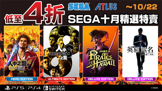 SEGA 世雅今日(10/22)宣布,已展开「SEGA 十月精选特卖」活动,针对PlayStation Store 及Nintendo eShop 所贩售的部分PS5/PS4/Nintendo Switch 游戏作品提供限时特价。 再次从人生谷底翻身的男人春日一番与面临人生最后挑战的男人桐生一马,以双主角视点展开激荡出精彩故事的RPG《人中之龙8》终极版迎来60% OFF 优惠。过去曾是令人畏惧的凶狠黑道真岛吾朗,为了寻找失去的记忆和宝藏而向大海出航的《人中之龙8 外传夏威夷海盗》豪华版则以43% OFF 的优惠价格登场。 此外,以海外版《Yakuza: Like a Dragon》为基础重新编辑的《人中之龙7 光与暗的去向国际版》Hero Edition 将以20% OFF 的优惠价格促销。以4 人队伍携手共斗的正统派动作RPG《碧蓝幻想Relink》Special Edition 亦以55% OFF 的优惠价格列入本次促销行列之中。 PlayStation Store 特卖结束日期为10 月22 日,Nintendo eShop 特卖结束日期为10 月21 日。 特价作品和折扣等活动详情请至下方特设网站确认。 SEGA 十月精选特卖:https://sales-event-asia.sega.com/sale/cht/ PS5 / PS4 《人中之龙8》终极版 PS5 / PS4《人中之龙8 外传夏威夷海盗》豪华版 PS5《人中之龙7 光与暗的去向国际版》Hero Edition PS5 / PS4《碧蓝幻想Relink》Special Edition ★根据平台不同,活动开始时间和贩售价格也将有所不同。此外,购买时请务必确认作品价格是否已变更为优惠后价格。 |