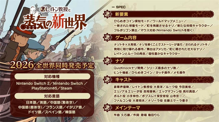 LEVEL5 于线上资讯节目「LEVEL5 VISION 2026 匠」中,公开了系列累计销量突破2,000 万套的《雷顿教授》最新作《雷顿教授与蒸气新世界(レイトン教授と蒸気の新世界)》最新宣传影片与声优访谈内容,并一并更新多项关键资讯。 LEVEL5 社长日野晃博再度确认本作预计2026 年末推出,目标全球同步发售;平台除既有的Nintendo Switch 2、Nintendo Switch 外,也新增了PlayStation 5 与PC(Steam)版本。 开发进度上,日野晃博指出游戏系统已「几乎完成」,目前正集中进行演出等细节的打磨;日文版配音收录已完成,接下来将进入海外版本的在地化作业阶段。 故事舞台设定在《雷顿教授与最后的时光旅行(レイトン教授と最后の时间旅行)》的一年后,雷顿教授与路克来到美国都市「真契拜森(Steam Bison)」,该地因「万能蒸气机关」而迅速发展,甚至超越伦敦。主线将从当地发生的不可思议事件展开,描写两人新的冒险。 小镇上流传着关于「亡灵神枪手」的传闻,雷顿教授对此抱持怀疑,但事件背后似乎隐藏着难以解释的谜团。另一方面,路克受富豪千金爱丽诺亚委托,协助寻找并救出遭到绑架的姊姊爱丽达,同时也牵扯出各方势力的动向。 本作的谜题制作由知识娱乐团队QuizKnock 参与,强调将收录系列史上最多数量的谜题。 音乐阵容是本次的重点新情报之一。本作主题曲将由久石让负责作曲,并由几田莉拉(YOASOBI 主唱ikura)担任作词与演唱,以「特别合作」形式进行制作,更多资讯留待后续消息公开。日野表示,自己也很期待最终会完成什么样的歌曲。 声优阵容方面,已确认雷顿教授由大泉洋配音、路克由今田美樱饰演;节目亦公开多位新角色的声优资讯,包括吉冈里帆、高杉真宙、小手伸也、山寺宏一、大冢明夫、佐藤蜜雪拉倭子(佐藤ミケーラ倭子)等人参与演出,为新舞台的角色群像增添看点。相关制作过程与声优访谈也于本次节目中同步曝光。 《雷顿教授与蒸气新世界》目前仍以2026 年发售为目标持续开发中,预计对应繁体中文。更多细节如上市日期、售价、主题曲完整资讯等,将于日后逐步揭晓。 |