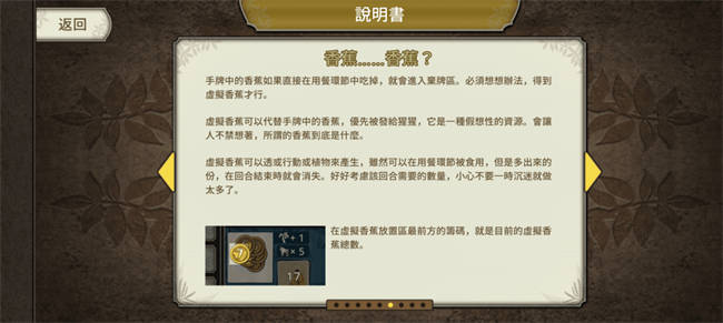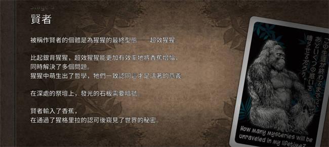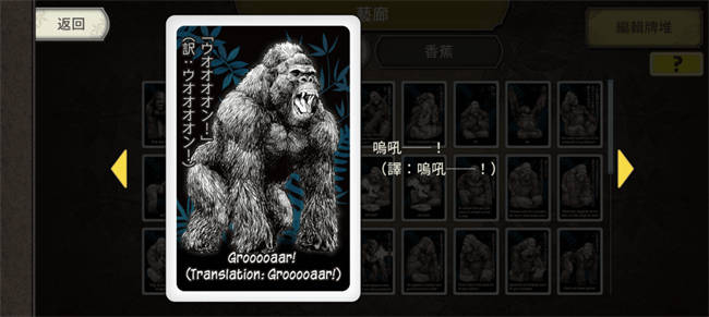 前略,各位读者生鱼好。今天要介绍的《大猩猩接龙》呢,是一款非常魔性的单人卡牌游戏,玩家必须巧妙地使用各种「行动」,借此产生出足够的香蕉来让猩猩吃,并让猩猩达到一定的数目从而获得胜利。除了有趣的玩法外,幽默中带点反讽的文字描述也是本作的一大看点,如果你喜欢奇特主题的作品或者卡牌游戏,那么可千万别错过了。 ∥基本资料(゚-゚ミэ)Э 项目 内容 游戏名称 大猩猩接龙 发行/代理 ARC SYSTEM WORKS 主题 带领大猩猩前往新世界 剧情体量 极少 美术 姑且算是写实派 玩法 单人大猩猩增殖卡牌 附加价值 有大猩猩 ∥主题/剧情★★★ |是猩猩,但也不只是猩猩╮(′~‵〞)╭| 既然名字都叫做《大猩猩接龙》了,那么本作的主题自然就是一群原始大猩猩在接龙...怎么想事情都不可能这么简单的吧?而为了更方便说明呢,这里请允许个鱼先引用两段游戏中的文字: “在猩猩数量骤升,而香蕉产量供不应求的环境之下, 某些猩猩身上开始产生了变化。 于是,地位高于其他猩猩的伟哉猩猩诞生了。它们在工作上表现优异,并终于对粮食问题提出了崭新的解决方案:由于猩猩是完美的生物,所以当然也能完美地化身为香蕉。被选上的猩猩对于能够奉献自己感到无比喜悦,但提案者本人却没有要牺牲自己的意思。” -STAGE2《更高的境界》 “3只猩猩围成一圈仰望着新月,从虚无之中迸出了虚拟香蕉。虚拟香蕉的效用虽然和香蕉相同,但总觉得哪里不对。” -行动《新月》 相信你们也看出来了,《大猩猩接龙》其实是一部一本正经讲干话风格的作品,其透过幽默的口吻,以略带反讽而又充满哲学性质的方式,讲述了一段猩猩们努力度过灭绝危机的宏伟史诗(?),喜欢这种调调的玩家肯定可以从中获得不少乐趣。不过这里也必须先提醒一下,本作的剧情量实际上并不是那么多,主线全部加起来大概千字上下而已,因此倒不建议真的放太多期待在这方面,还是就把这当成增添打牌乐趣的小小Bonus,或许才是更刚好的心态。 这暗号会不会太容易破解了点? ∥角色★★★ |这绝对该出成Line贴图吧(`・ω・´)| 虽然摆在「角色」这个区块来谈好像哪里怪怪的,但总之,本作的卡片可以分成「猩猩」以及「香蕉」两种类型。注意喔,这里的「两种」是真正意义上的两种,从规则来讲牌就只有猩猩与香蕉之分,而不是说猩猩牌里面可能有各种效果不同的猩猩那样。 不过,尽管只有两种牌,本作在卡面这块却完全没有因此偷工减料,甚至反而可以说有点用力过猛了,光猩猩牌就有足足57种版本,堪称卡牌游戏中的单卡异图数目之最(当然这样算有点犯规啦)。更关键的是,这些猩猩牌们个个都兼有着异常魔性的卡面与超越人智(?)的说明,趣味性非常高,如果出成LINE贴图肯定很多人会想买(?)。 呜吼──! |不管几根,都是一根( ͡° ͜ʖ ͡°)| 说完了猩猩,香蕉的部分自然也是要提一下的。相对于猩猩牌,香蕉牌不仅卡面种类少了不少(只有28种),内容上也比较没那么有梗,就是各种根数与不同成熟程度的香蕉而已。不过其实真要讲起来,光是「卡面有不同根数的香蕉」这件事本身,就已经是香蕉牌最大的梗点了。因为在关卡中,不管卡图上画了几根香蕉,永远都还是只能当成一根香蕉来用,这种前提下还故意去画出那么多有一堆香蕉的卡面,你们就知道制作组有多恶趣味了ლ(・´ェ`・ლ)。 官方吐嘈最为致命 ∥美术★★☆ |一眼不让人惊艳,但至少满均衡的( • ̀ω•́ )| 相对来说,《大猩猩接龙》的美术比较缺乏那种一眼看上去就让人非常惊艳的内容,顶多就是卡面的部份多少能靠趣味性跟细腻度抓住目光,但毕竟卡牌游戏圈子的卡面竞争是非常激烈的,所以确实不好说这样的卡面有到多么突出的程度。不过也幸好,本作在UI/UX这块的表现相当不错,颜色搭配、装饰元素使用、区块分隔的处理都很合宜,整体与卡牌的部分一同提供了一种均衡且舒适的视觉体验,这就是本作超车一些卡牌游戏的地方了。 顺带一提,个鱼自己莫名特别喜欢这个举手猩猩(?)的图示 ∥玩法★★★☆ |虚拟香蕉当然也是香蕉๛ก(ー̀ωー́ก)| 在正式开始聊《大猩猩接龙》的玩法之前,这里个鱼想要先罗列一下本作比较重要的几个规则,方便大家更容易了解这款游戏到底在玩什么: